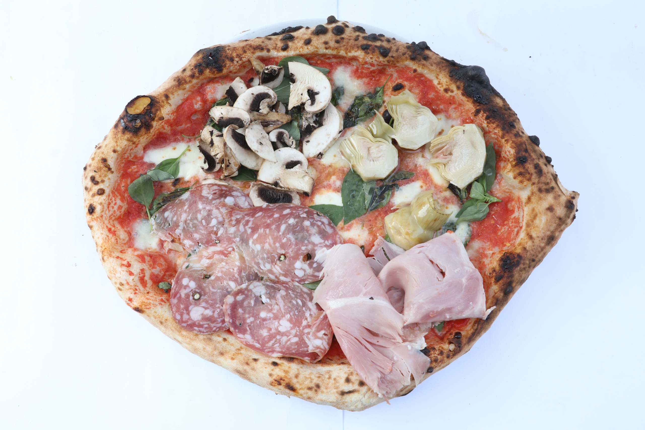 Tomaten, Mozzarella, Parmigiano Reggiano, Basilikum, Salami Napoli, Beinschinken, Champignon, gegrillte Artischocken, EVO Bio