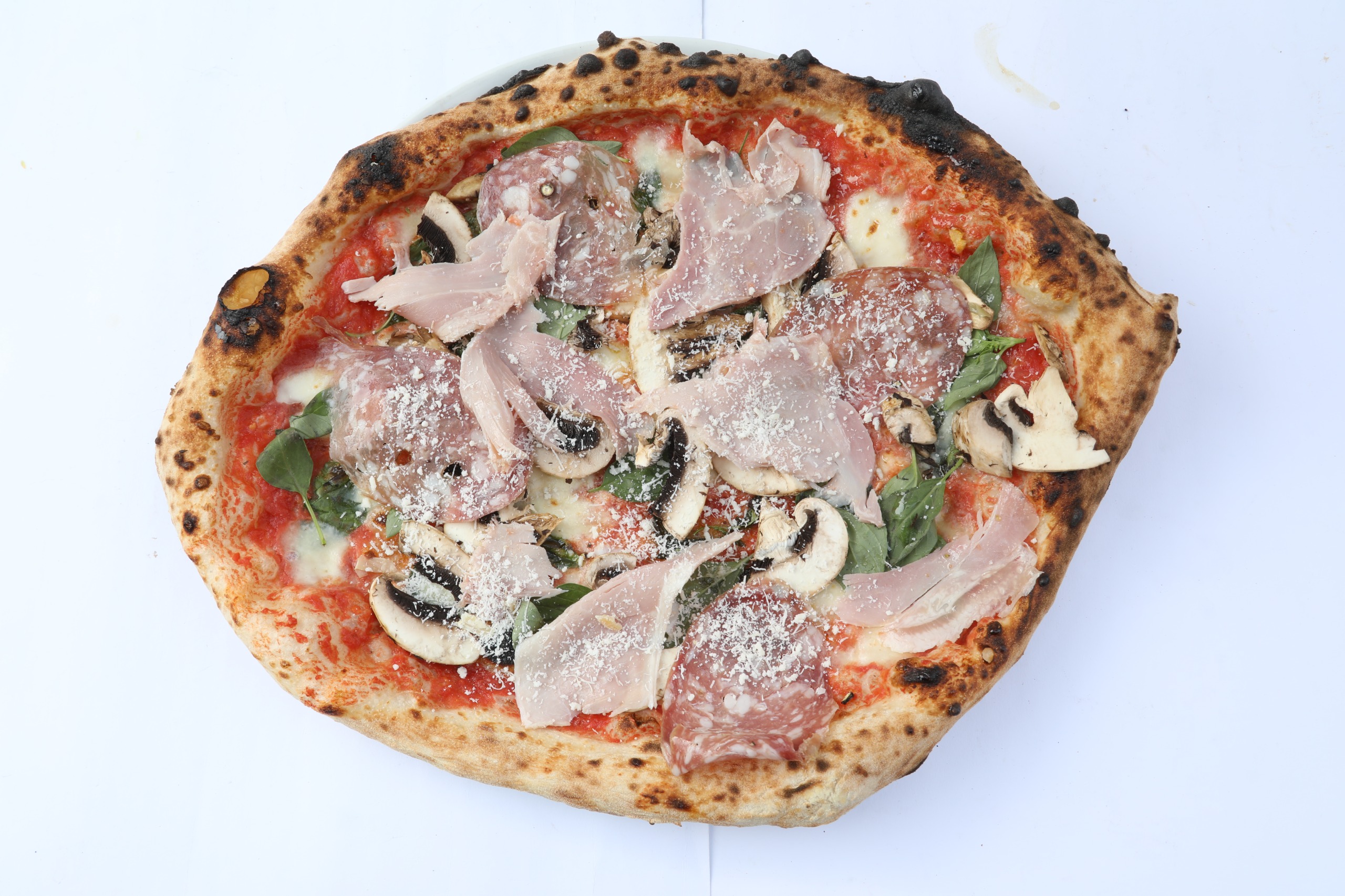 Tomaten, Mozzarella, Parmigiano Reggiano, Basilikum, Salami Napoli (mild), Beinschinken, Champignon, EVO Bio