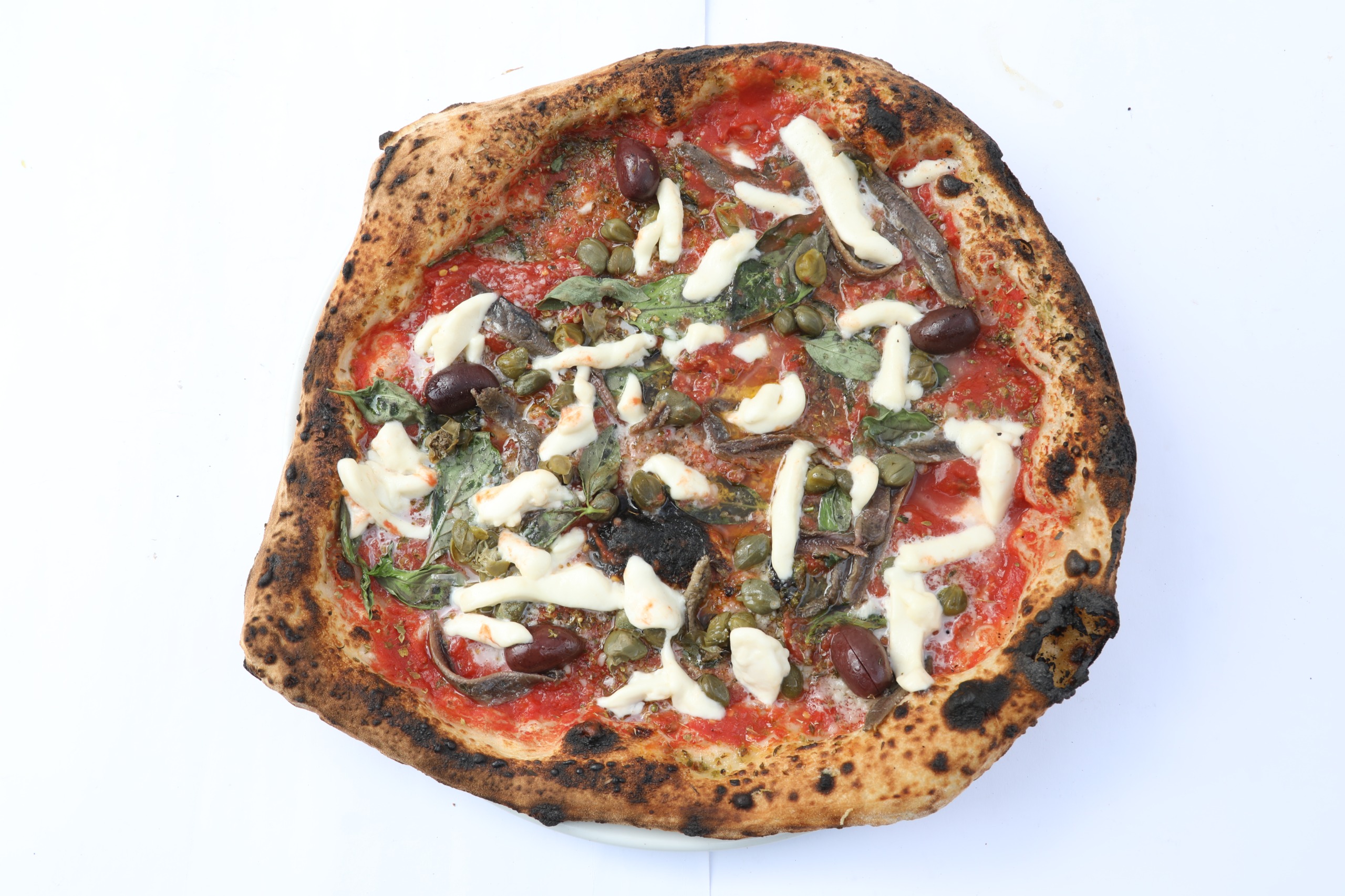 Tomaten, Mozzarella, Basilikum, Kapern, Sardellen, schwarze Oliven, Knoblauchöl, EVO Bio