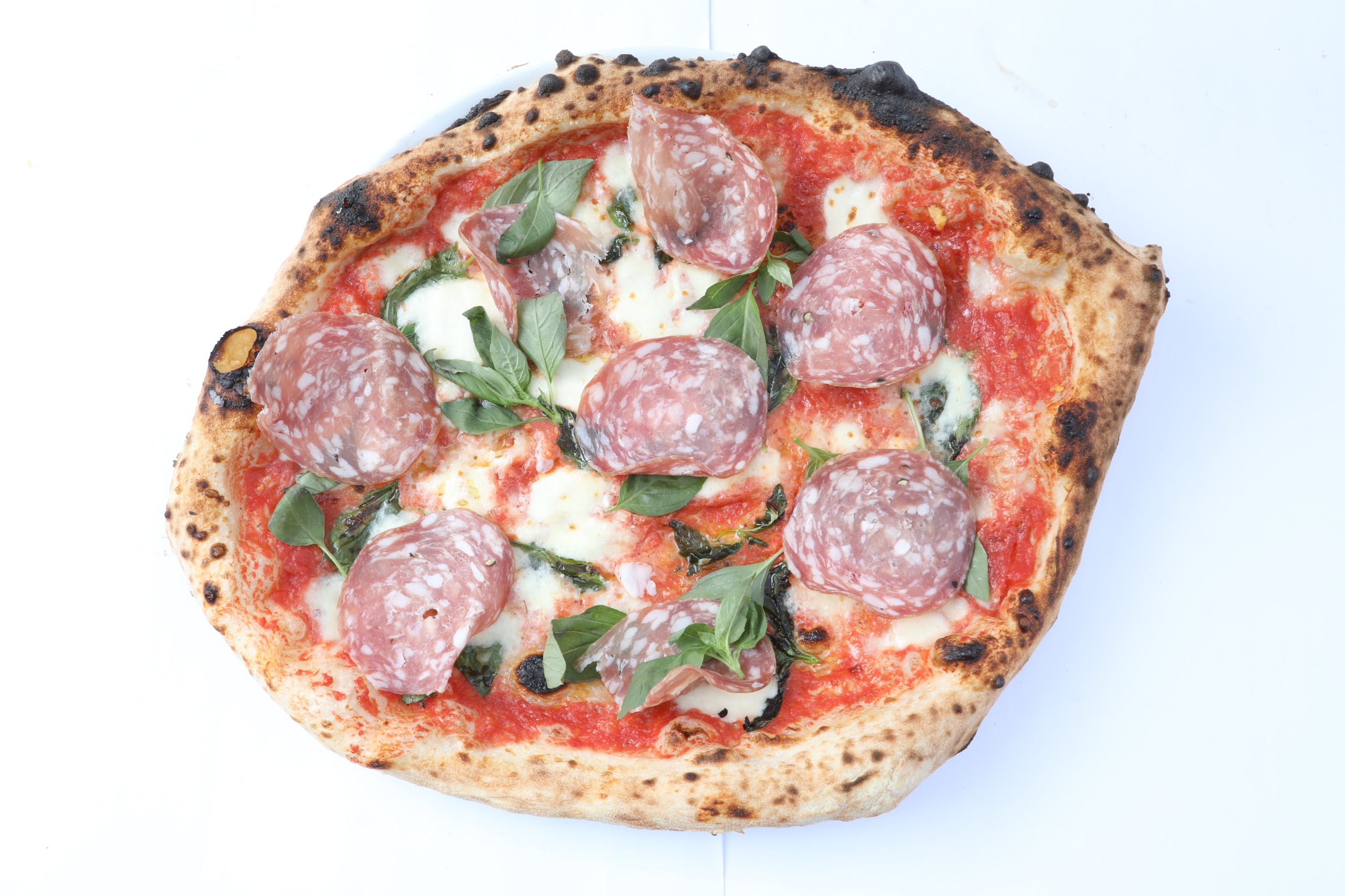Tomaten, Mozzarella, Parmigiano Reggiano, Basilikum, Salami Napoli (mild), EVO Bio