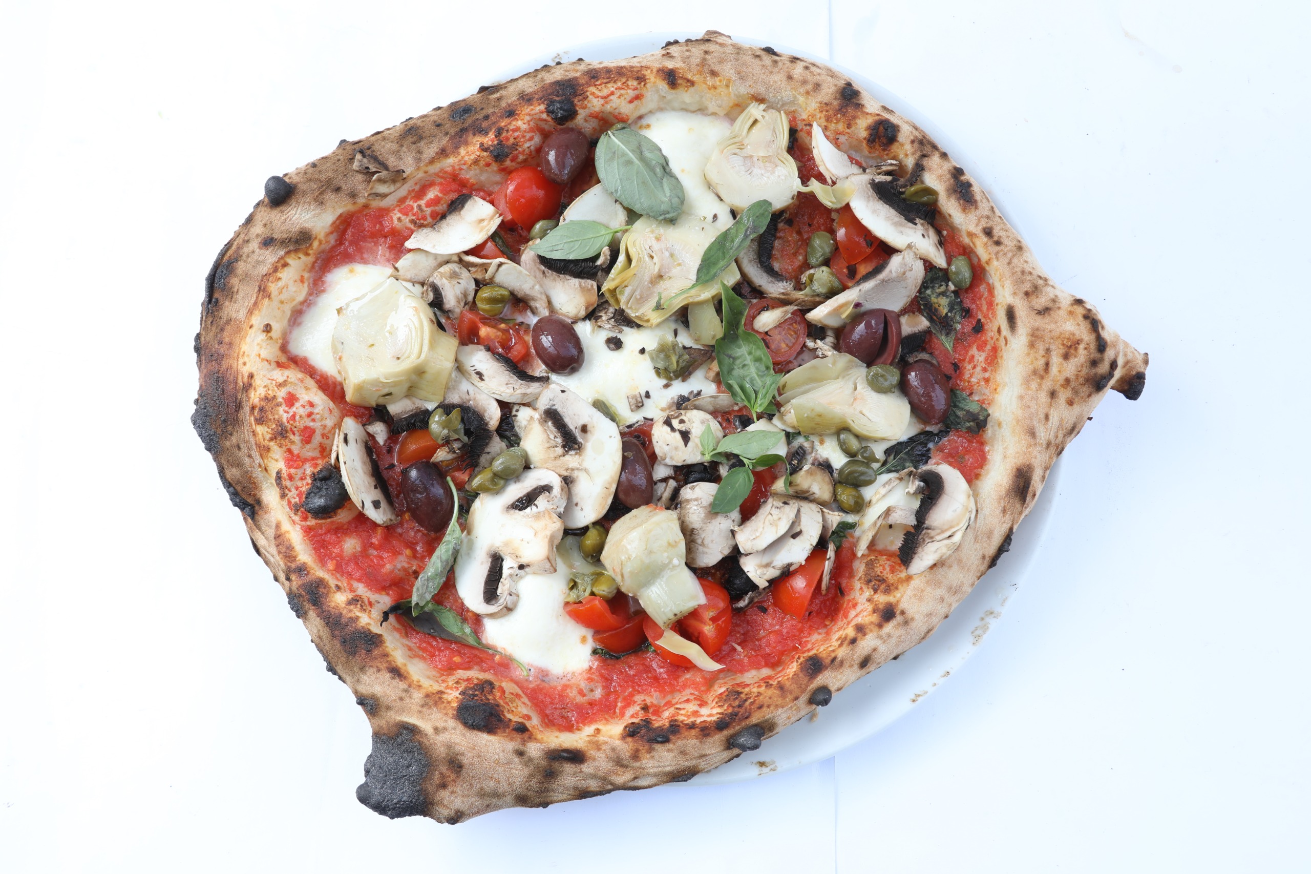 Tomaten, Mozzarella, Parmigiano Reggiano, Basilikum, Champignon, gegrillte Artischocken, Kirschtomaten, schwarze Oliven, EVO Bio